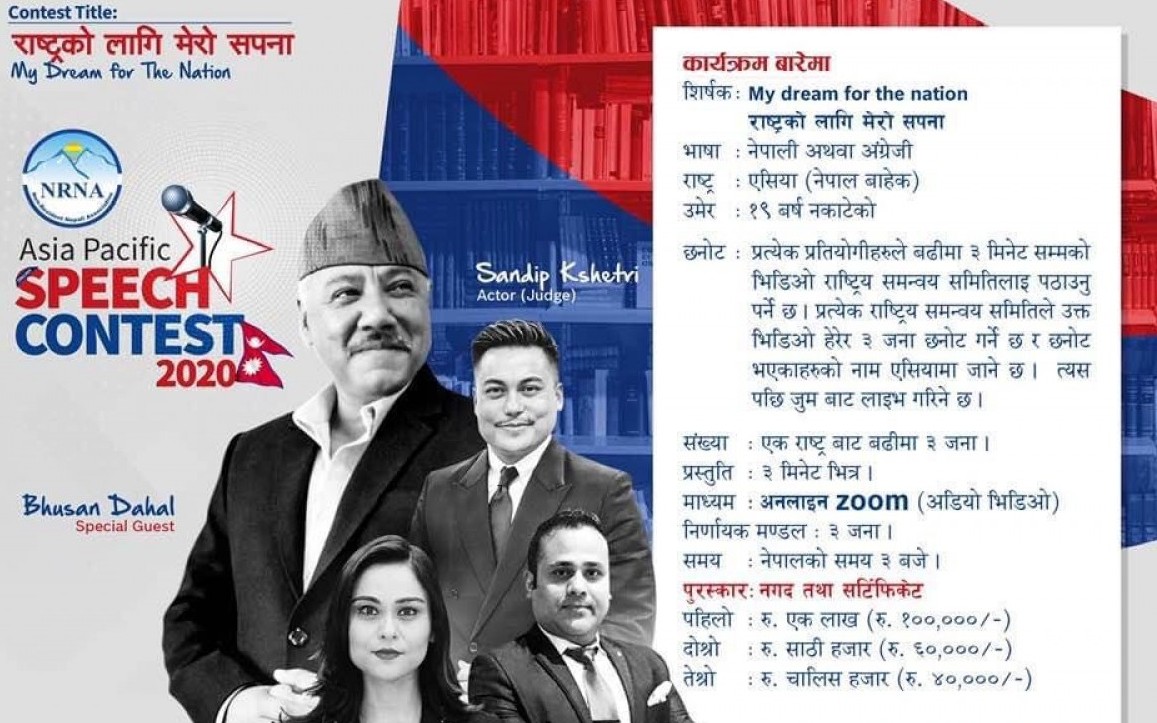 गैरआवासीय नेपाली संघ एसिया प्याशिफिक युवा कमिटिको आयोजनामा आज आईतबार हुनलागेको एनआरएनए वक्तृत्वकला प्रतियोगितामा ३० देशका ६० जनाले उपाधीका लागि प्रतिस्पर्धा गर्ने भएका छन। ‘राष्ट्रको लागि…