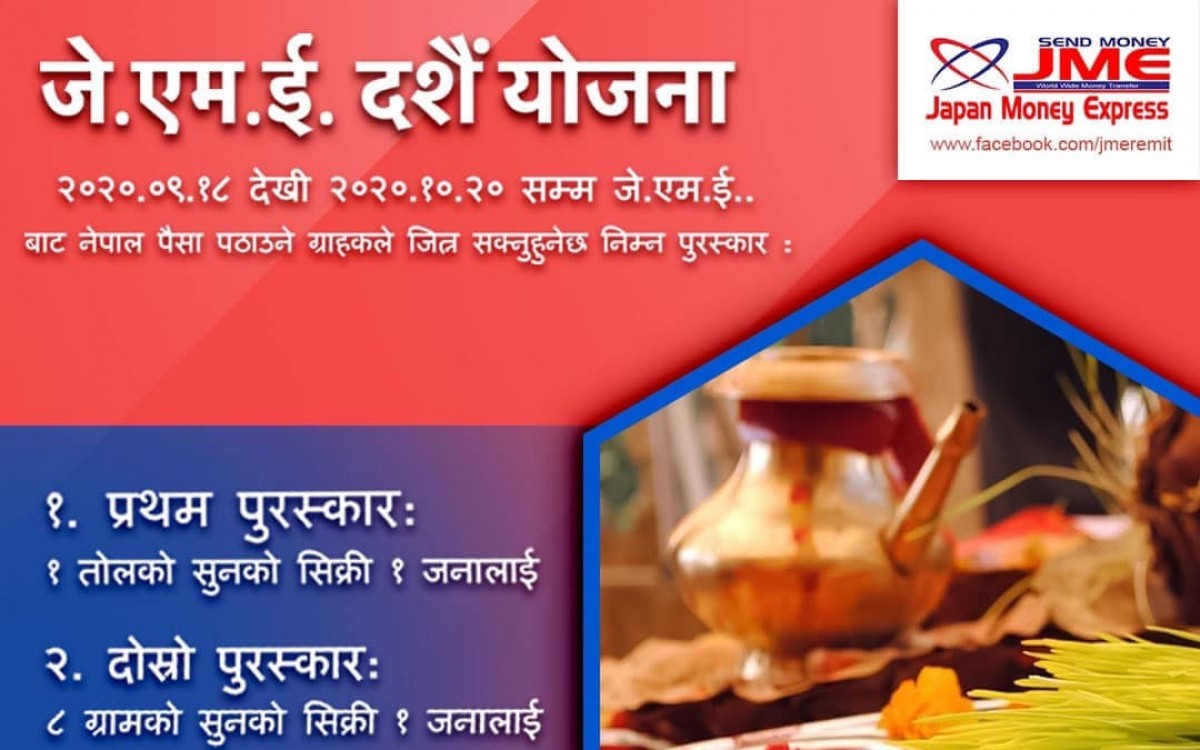 टोकियो । जापानमा नेपालीद्धारा संचालित पहिलो रेमिटयान्स कम्पनी जापान मनी एक्सप्रेस (जेएमई) ले संचालन गरेको दशैं सुनको बहार कार्यक्रम अब एक साता मात्र बाँकी रहेको…